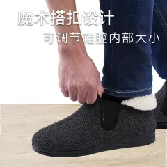 云舒暖履--男尺码款两侧松紧布、方便穿脱、内腔宽松、360度高 泡复合、柔软舒适、亲肤保暖、内里防霉防菌 、帮面防泼溅、双密度海波力人体工学鞋垫、 缓震缓解疲劳、鞋帮鞋底结合零胶水、防滑耐 磨、高帮保暖护脚踝。脚宽、脚胖、拇趾外翻 、大脚骨、叠趾、术后康复、需陪护穿鞋等场 景