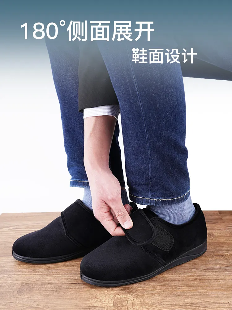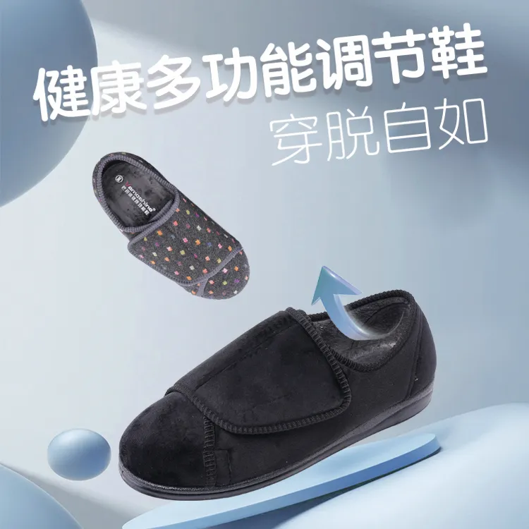 内腔可调节、更便于穿脱、360度高泡复合、 柔软舒适、亲肤保暖、内里防霉防菌、帮面防 泼溅、双密度海波力人体工学鞋垫、缓震缓解 疲劳、鞋帮鞋底结合零胶水、防滑耐磨。脚宽 、脚胖、拇趾外翻、大脚骨、叠趾、术后康复 、失能/半失能、需陪护穿鞋等场景